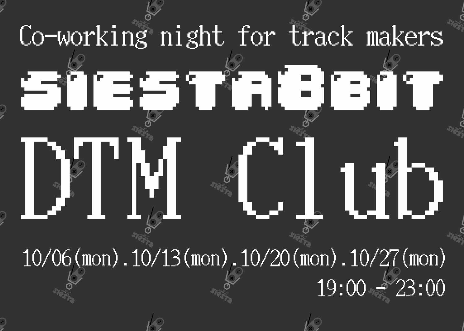 Co-working night for track makerssiesta8bit DTM club 11/04(tue).11/11(tue).11/18(tue).11/25(tue) 19:00-23:00No… →