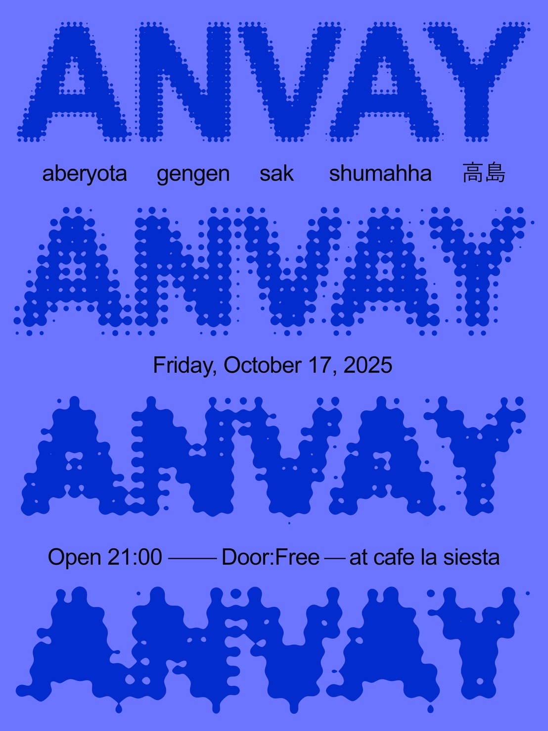 2025.10/17 (fri)ANVAY 21:00-no charge (please order 1d) aberyotagengensakshumahha高島 venue: cafe la siesta – 8b… →